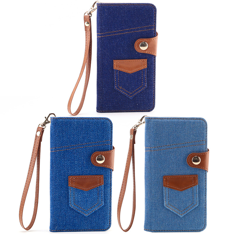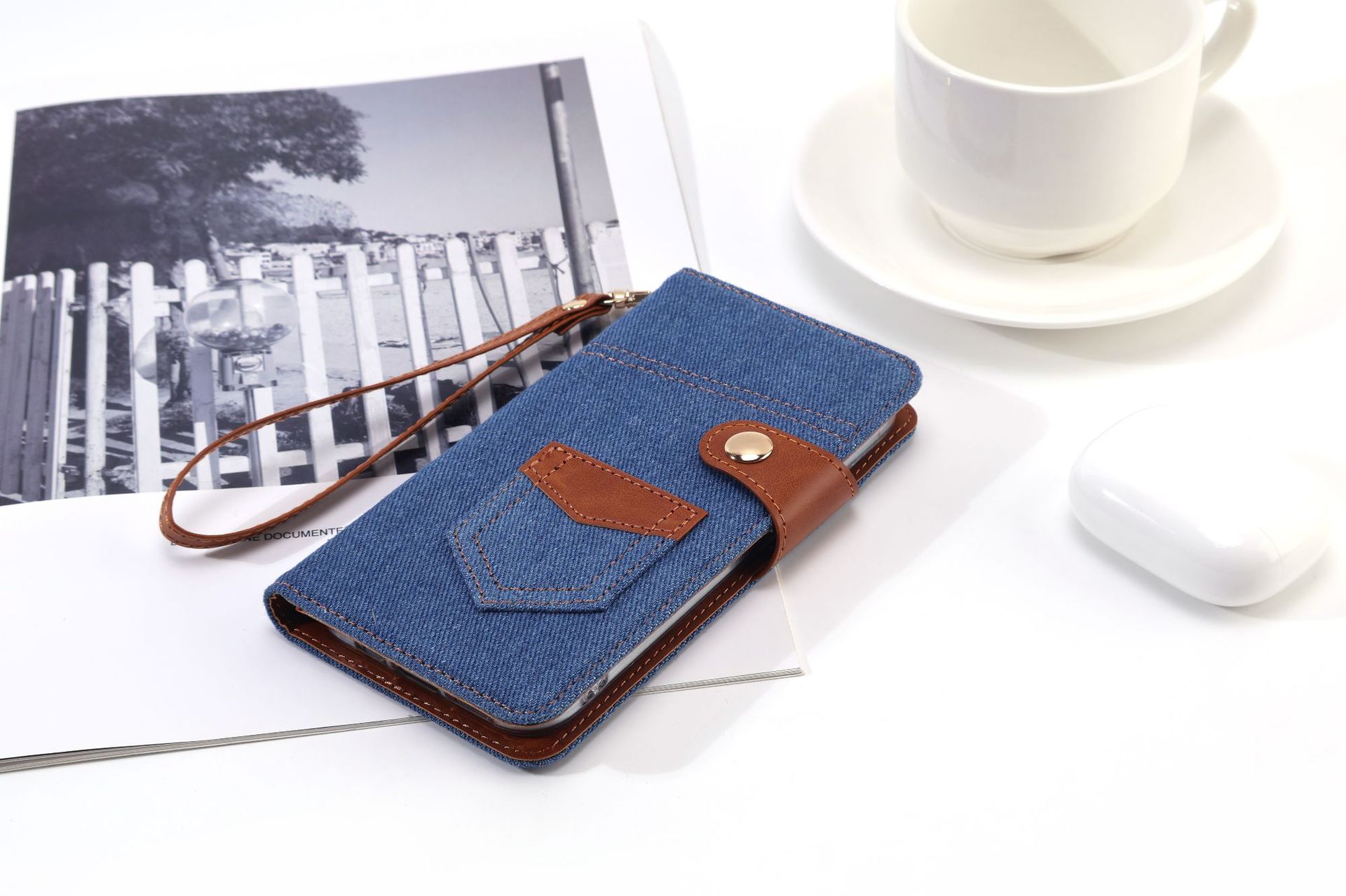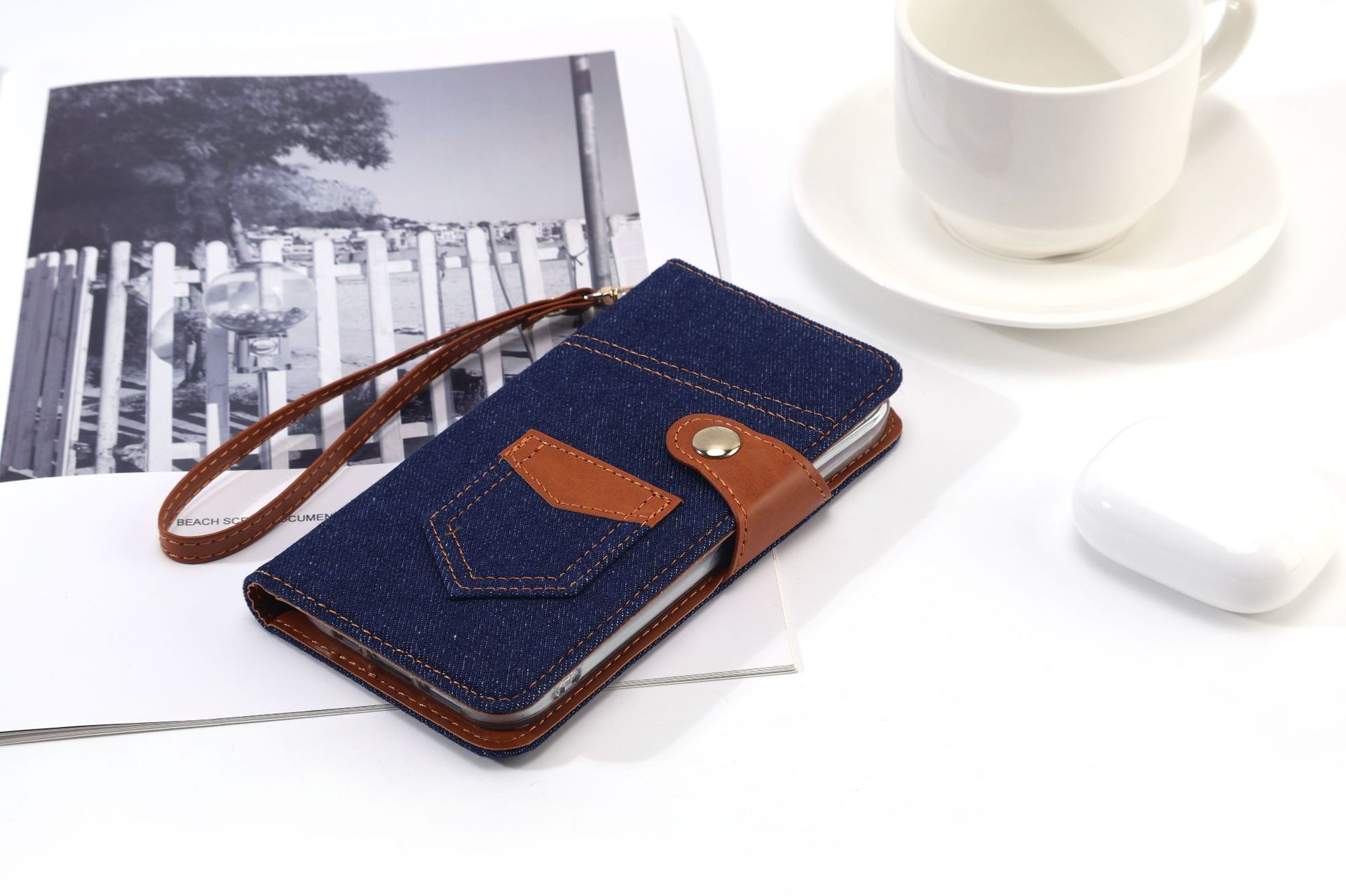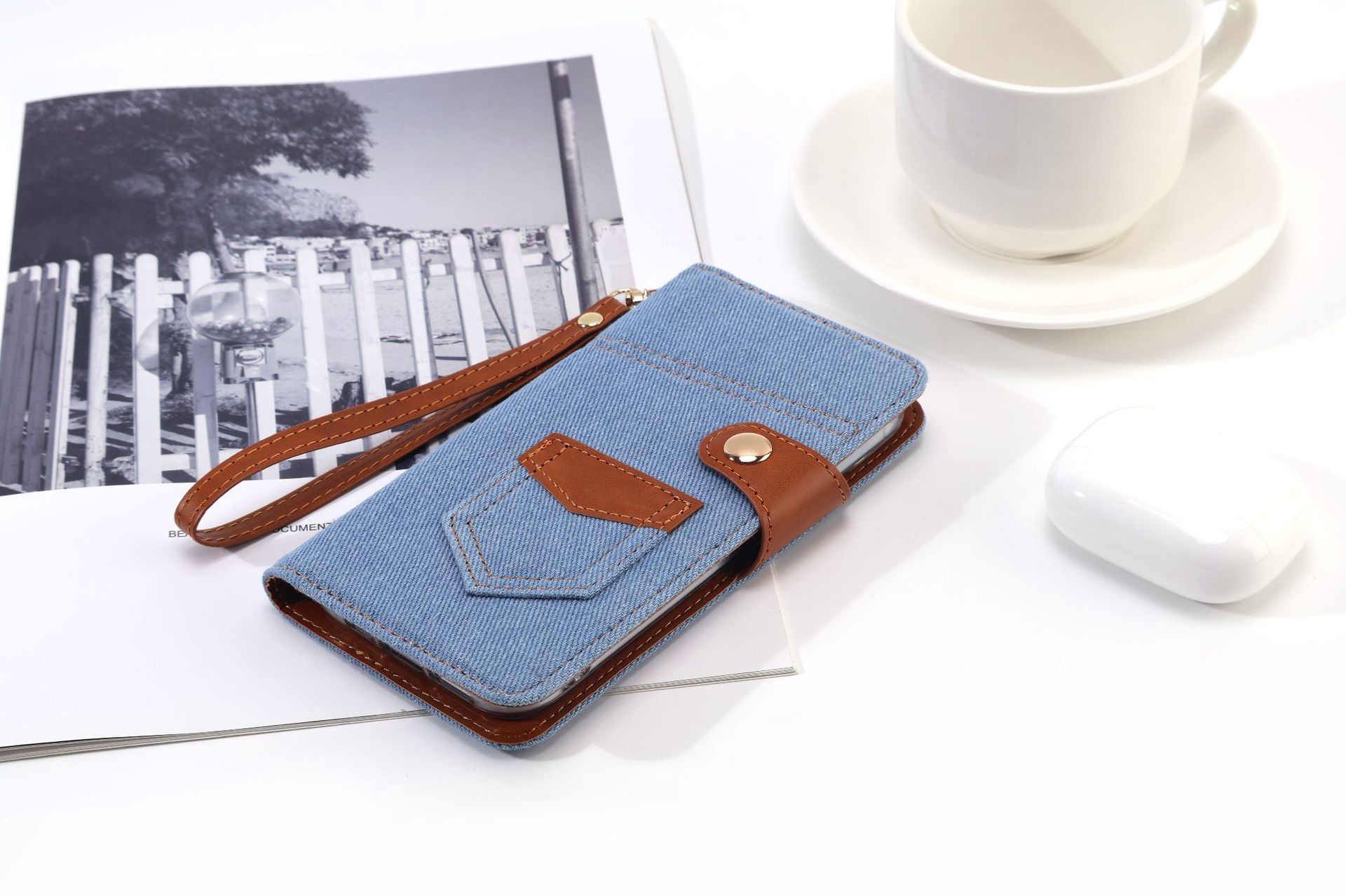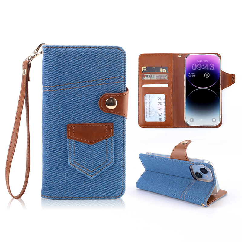 カジュアルなデニム風素材と本革風の異素材を組み合わせたおしゃれな手帳型スマホケースです。